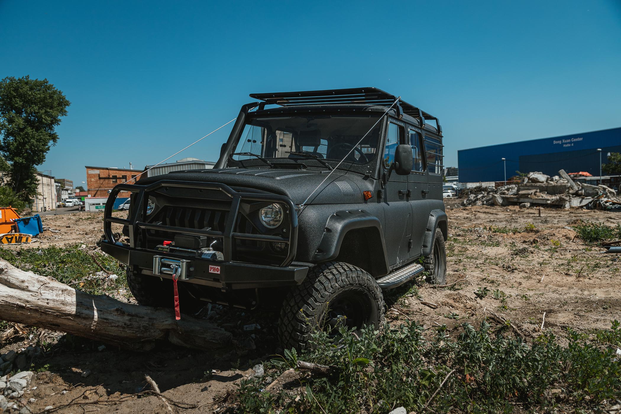 Umbauten Frontschutzbügel aus Stahl mit elektrischer Marken-Seilwinde (Zugkraft 12000 lb / 5400 kg, per Fernbedienung bedienbar), Rammschutz hinten mit Anhängerkupplung, Frontschürze verstärkt, Unterfahrschutz, Einstiegshilfen an den Seiten, Ansaugschnorchel, Dachgepäckträger mit Leiter, Fahrzeug wurde höhergelegt, alle Lichter sind mit Gittern geschützt